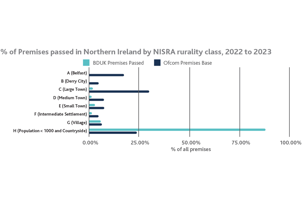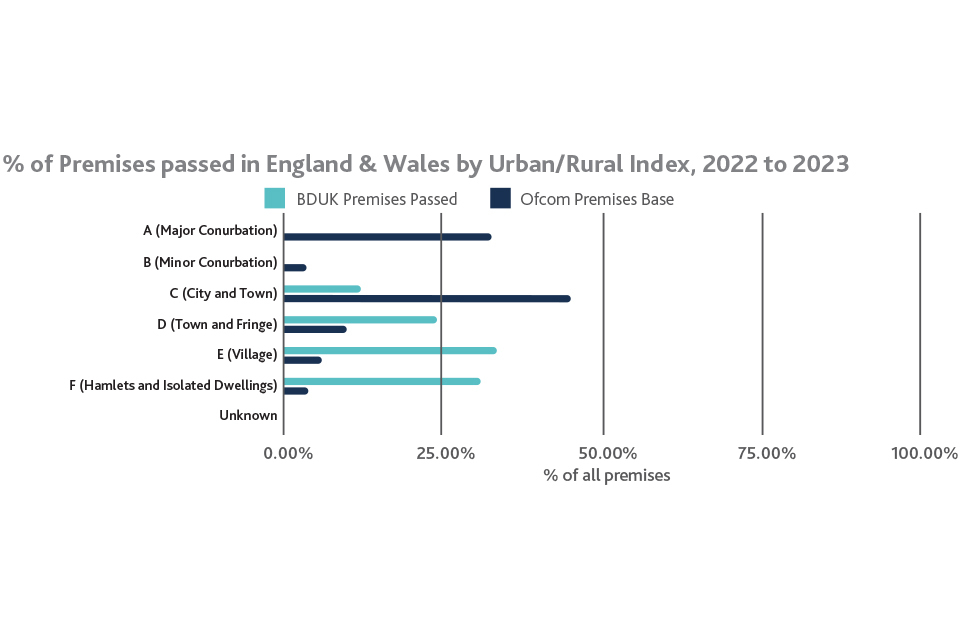 In 2021, BDUK was set the target of reaching 1.56 million hard-to-reach premises with gigabit-capable broadband. This figure was based on 5% of total UK premises as recognised in Ofcom’s April 2021 Connected Nations report. By March 2023, we had passed 929,700 premises with gigabit-capable connectivity through our interventions. This includes 865,400 that are part of Ofcom’s dataset, and a further 64,300 premises such as apartments in multiple dwelling units that are not included in Ofcom’s figures.