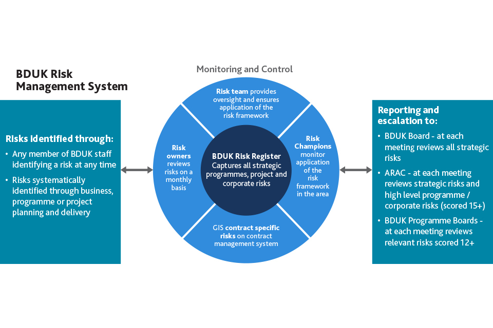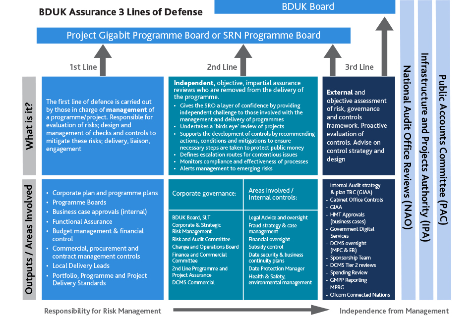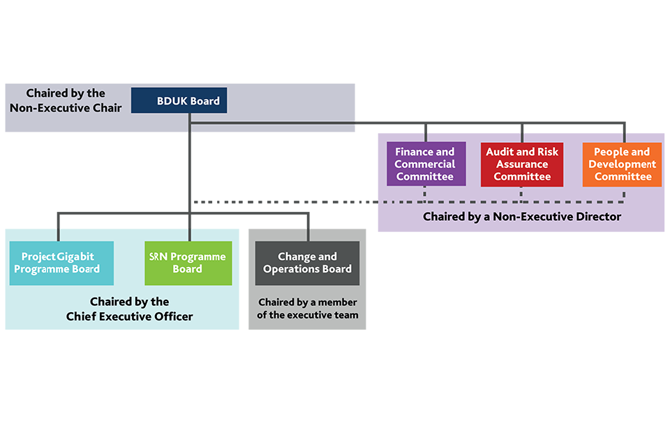 Our Chief Executive Officer (CEO) is both the Accounting Officer and the Senior Responsible Owner for our two major programmes. The CEO is held to account by the Secretary of State, Minister of State, and DSIT’s Principal Accounting Officer, and is advised and challenged on strategy, delivery and risk management by BDUK’s Board. As a part of the Government Major Projects Portfolio (GMPP), Project Gigabit is subject to regular scrutiny by the Infrastructure and Projects Authority (IPA). The Shared Rural Network is below the GMPP threshold but is subject to regular assurance from the sponsor department.