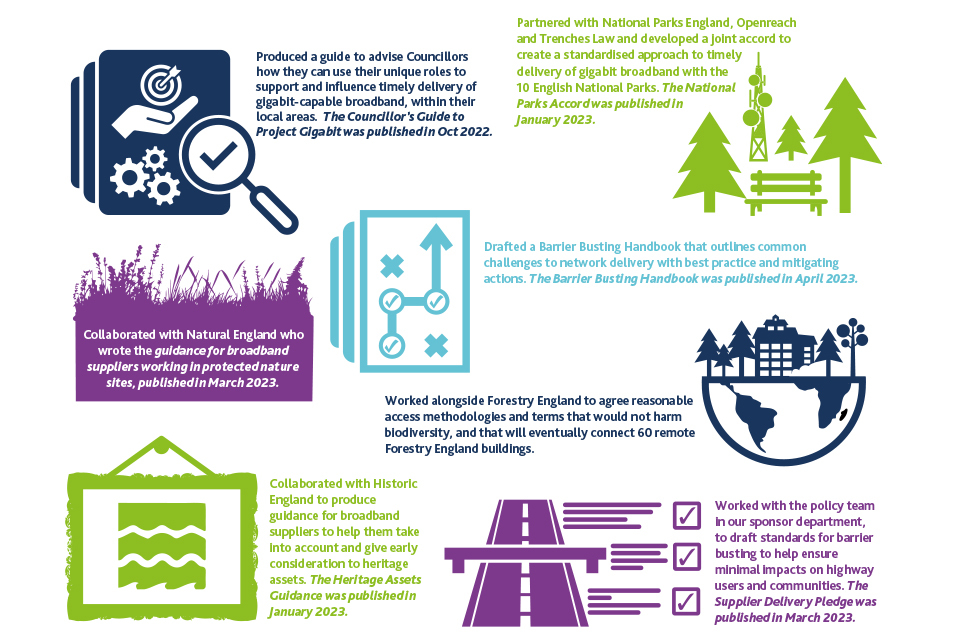 We have achieved all of our objectives for Project Gigabit set out in our Corporate Plan 2022 to 2023. We signed our first contract in North Dorset on 25 August 2022, and a further seven during the year, from Cornwall to Cumbria and Northumberland. These contracts will see suppliers bring gigabit-capable broadband to up to 147,000 hard-to-reach homes and businesses, and represent an investment of up to £247.7 million. We also launched a further 19 procurements worth up to £953.1 million and relaunched the Gigabit Broadband Voucher Scheme with an increase in voucher value.