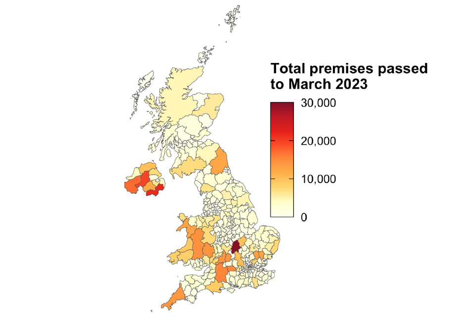 - Map indicating the total number of premises passed by BDUK interventions in each local authority district area up to March 2023.