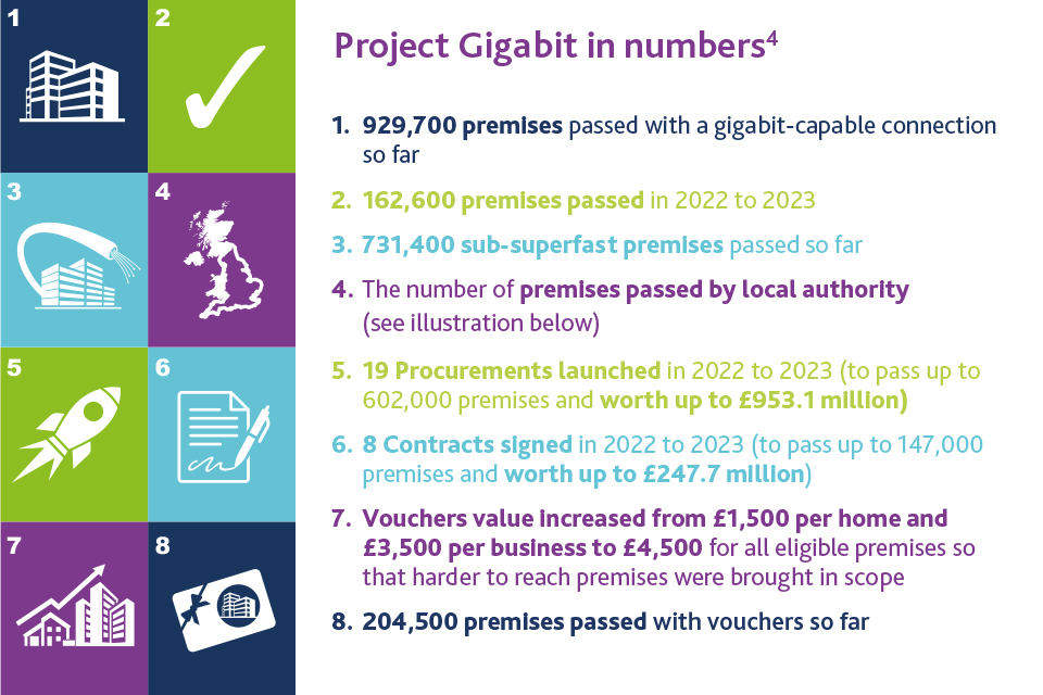 We are also delivering through legacy contracts under the Superfast programme, either extended to deliver gigabit-capable infrastructure, or delivering this as part of the original contract. Through these contracts, 93,500 premises were passed across the UK in 2022 to 2023.