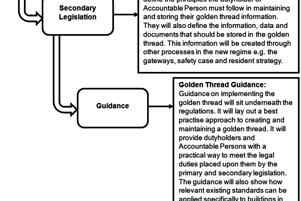 4.1 The primary and secondary legislation will be supported by guidance on the implementation of the golden thread for buildings in scope of the new more stringent building safety regime. The guidance will set out how dutyholders and Accountable Persons can ensure their golden thread meets the definition and principles. As set out above the golden thread definition and principles will inform the secondary legislation that MHCLG will produce and consult on in due course.