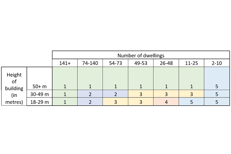 The table below details the tranches and their order of assessment. Height is measured in metres and the number of dwellings includes any flats or apartments in the building, whether or not they are currently occupied.