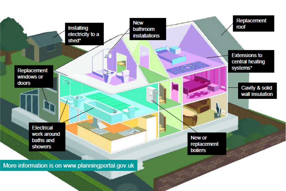 - most repairs, replacements and maintenance work (except replacements of combustion appliances, oil tanks, electrical fuse boxes or glazing units, which do need to be notified)