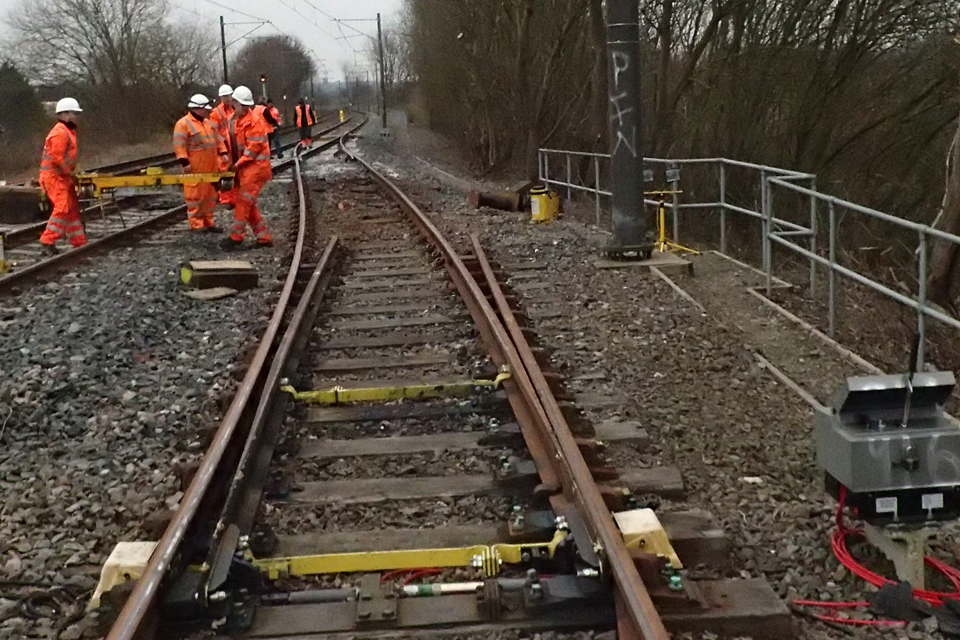 304B points. Shown set to 'reverse' with staff wearing orange high visibility clothing and safety equipment undertaking work on the railway