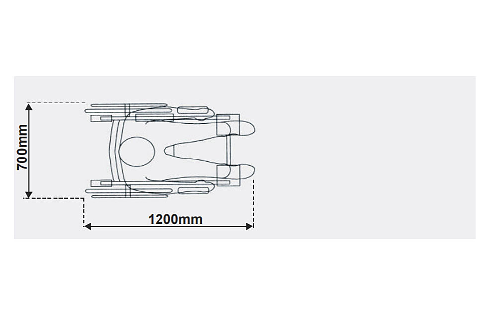 Aerial view of a person in wheelchair. Total height and width from this view is 700mm x 1200mm