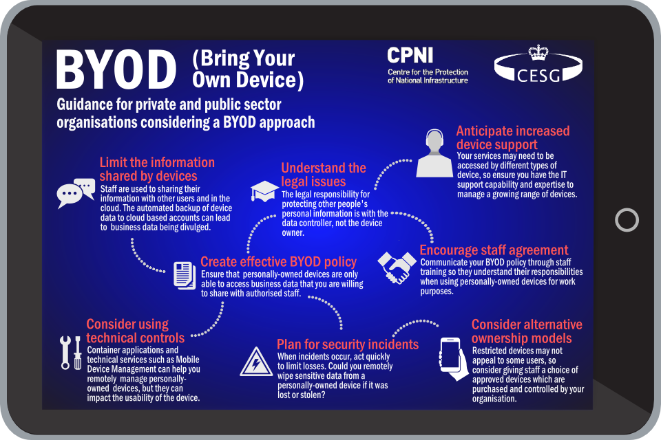 With the rapid increase in the use of mobile devices and the growth of remote and flexible working staff now expect to use their own laptops, phones and tablets to conduct business. This guidance is for organisations considering a ‘Bring Your Own Device’ (BYOD) approach, and describes the key security aspects to consider in order to maximise the business benefits of BYOD whilst minimising the risks. It also provides a useful reminder for those already implementing a BYOD approach. It should be used to inform risk management decisions for BYOD deployments, and is particularly relevant for public sector organisations operating at OFFICIAL within such deployments.