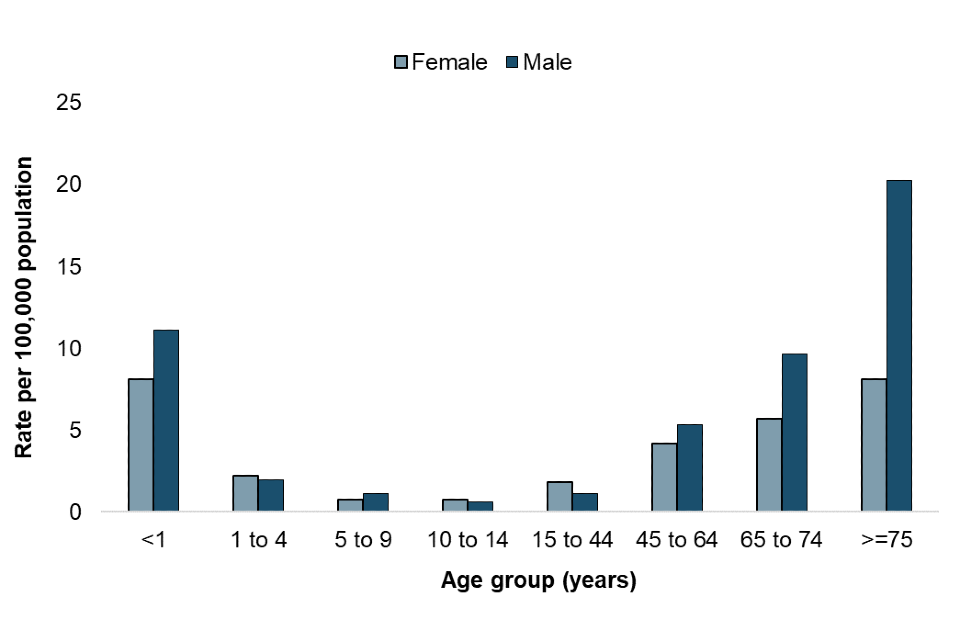 The highest overall rate of BSI due to yeast was seen in persons aged 75 years and over (13.3 per 100,000 population). This is consistent with findings in previous years (7) and is likely due to greater exposure to risk factors for invasive fungal disease such as invasive surgical procedures and prolonged use of broad spectrum antibiotics. Sex differences were more significant in older age groups; in persons aged 75 years and over, 12.2 more men (per 100,000 population) had BSI due to yeast in 2022 than women (males 20.3 per 100,000 and females 8.1 per 100,000). Whilst the highest rate for men was in the 75 years and over category, in females the highest rates of BSI due to yeast were seen in children under 1 year of age and females 75 years and over (both 8.1 per 100,000, Figure 3).