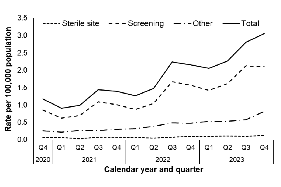 Although in this quarter the rate of CPO episodes continues to increase, from 2.8 per 100,000 population in Q3 2023 to 3.1 per 100,000 population in Q4 2023, this rise was predominantly due to increases in rates among ‘other’ sample types, and a small increase in the rate sterile site isolates (Figure 1). The rate of CPO episodes from screening isolates remained stable in Q4 compared to Q3 of 2023; however this rate represents a higher rate of episodes compared to quarters prior to Q3 2023.