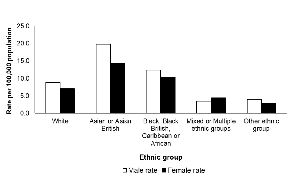 The Office for Health Improvements and Disparities developed a method for assigning ethnic group based on hospital admissions data. As different ethnicities may be recorded in different treatment episodes, the method selected a single ethnic group from a patient’s HES records. Episodes were linked to ethnic group using patient NHS number and date of birth.