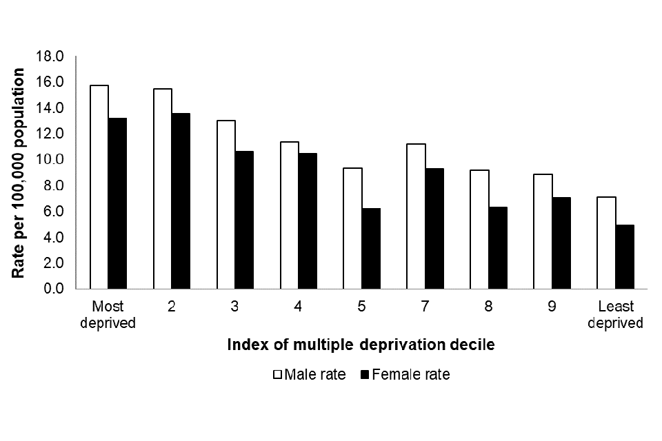 The index of multiple deprivation (IMD) is a way of summarising the level of deprivation within an area, based on a set of factors that includes their levels of income, employment, education and local levels of crime. Episodes were linked to IMD using patient postcode (and GP or laboratory postcode where patient postcode was unavailable) and the IMD decile score was identified by the lower super output area the patient resided in.