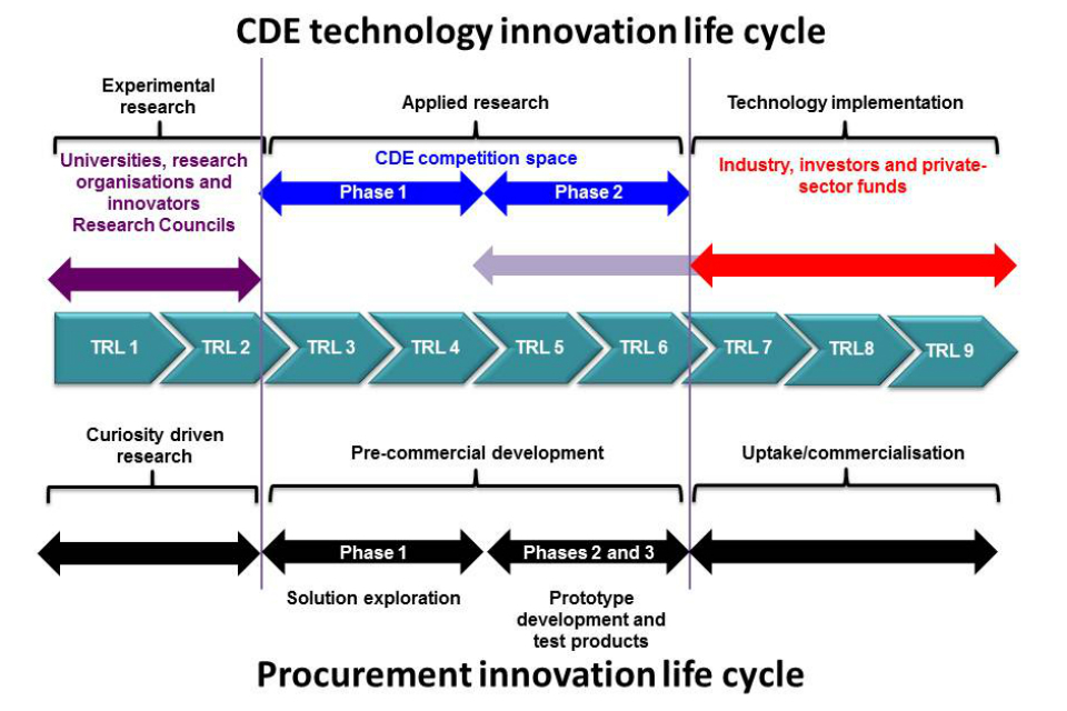 We’ll consider research proposals for the defence application of technologies that are mature in other sectors. These proposals must be research focused and include a significant proportion of work that is clearly within the research and pre-commercial development space of the innovation life cycle, at less than technology readiness level (TRL) 6. The diagram below shows the technology innovation life cycle, how this maps with TRLs and where this CDE competition fits in. For a description of TRLs access MOD’s Acquisition System Guidance.