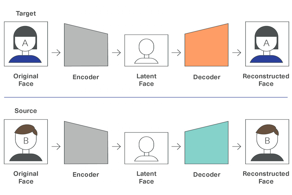 - Face replacement is made possible by training two of these neural networks – one for the source face and one for the target face. Both networks share the same encoder, which means that the decompressed version of both faces shares a similar baseline architecture. However, they have different decoders (see Figure 2). Both neural networks are left to train until the autoencoding process can reconstruct an image of a face similar to its original version.