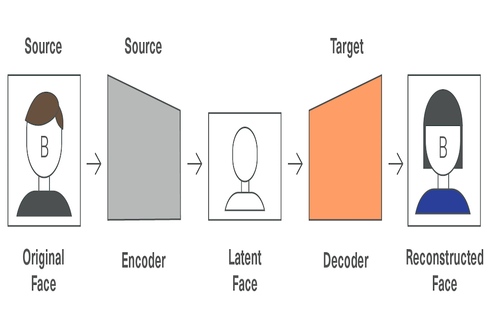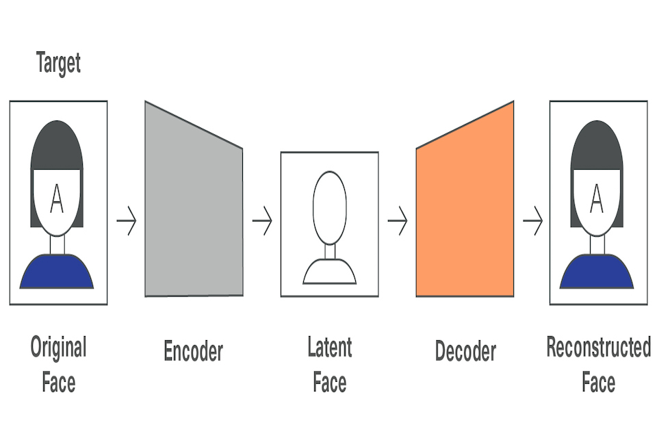 Training – The next task is to train the face replacement model using the images collected. This is done using an autoencoder, which is a neural network made up of two parts: an encoder and a decoder. The encoder takes an image of a face and compresses it into a low dimension representation, also known as the ‘latent face’. The decoder then takes that representation and reconstructs the face into its original form (see Figure 1).