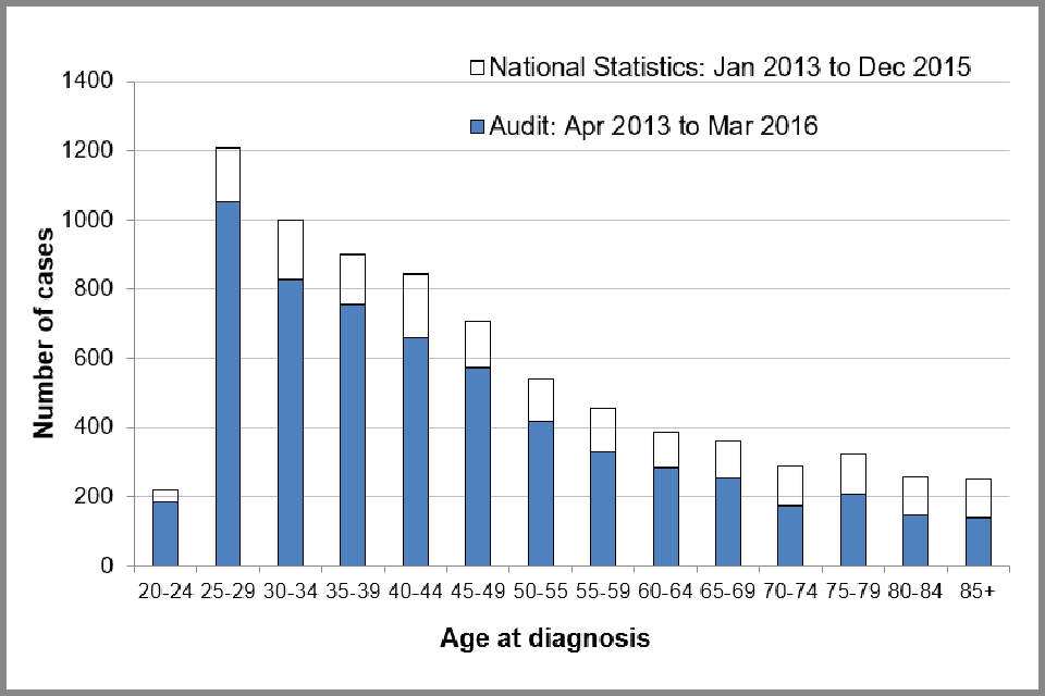 There is a trade-off between presenting data in a timely manner and the completeness of that same data. For details on how timeliness affects our estimates of the International Federation of Gynecology and Obstetrics (FIGO) stage and age at diagnosis please refer to the summary methods document. In this report we focus only on the most recently diagnosed cervical cancers by restricting the data in this report to 6,028 cases diagnosed between April 2013 and March 2016 and comparing them to 11,580 people without cervical cancer. However, where relevant we have used all cancers reported to the audit.