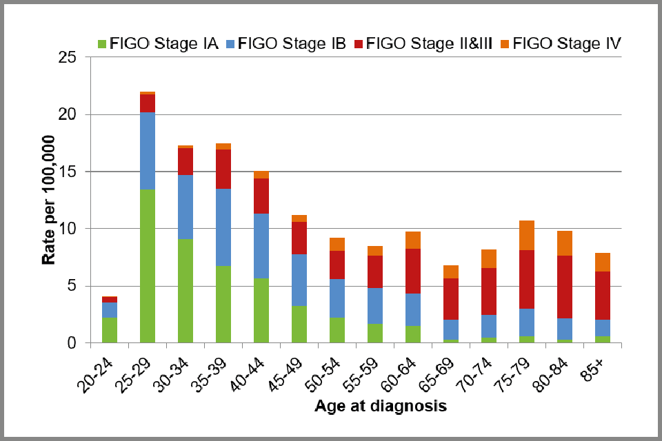 Bar chart showing observed incidence rates of cervical cancer per 100,000 women in England, 2015: by FIGO stage and age at diagnosis