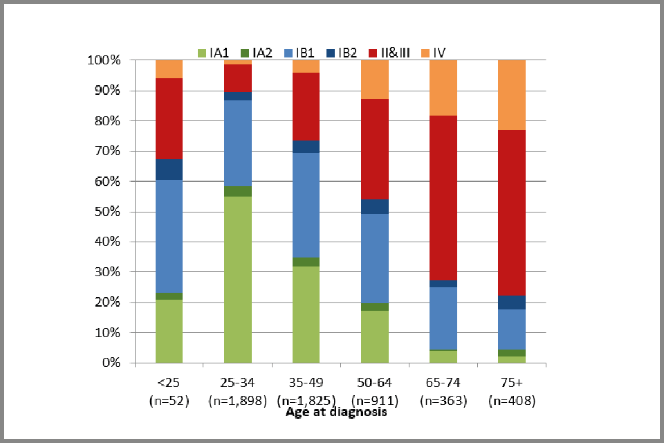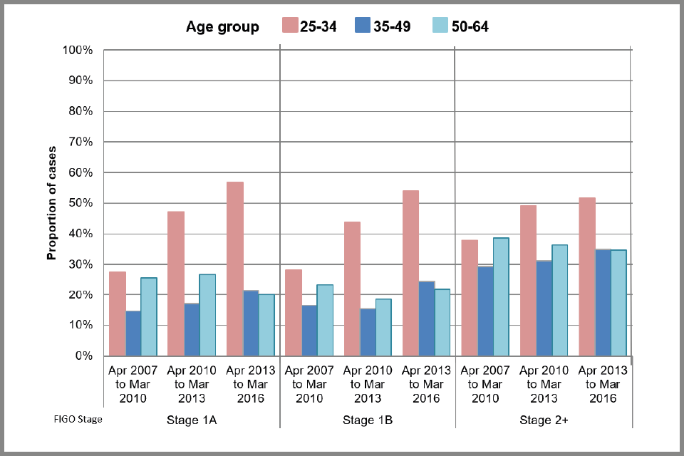 *cases reported as IB(NOS) are known to be stage 1B or worse but detailed stage is not known. As a proportion of all cancers, invasive cervical cancer at FIGO stage II or worse was more likely to be diagnosed in people over the age of 50 than in those under 50, with stage IA disease becoming less frequent with increasing age. This is because people diagnosed with cervical cancer over 50 are much less likely to have been screened recently than people of the same age without cancer. Their cancers are more likely to be diagnosed following investigation of symptoms and therefore present at a later stage. By contrast, between the ages of 25 and 49, the majority (46.8%) of cervical cancers were found to be stage IA (see Appendix B: data tables, Table 5a).