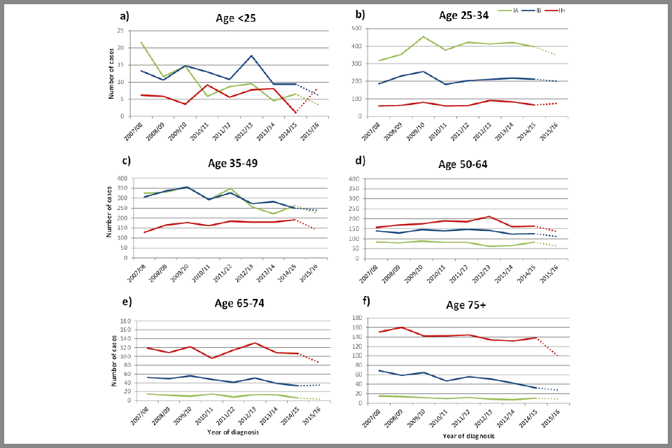 Figure 4 (see below) shows the estimated number of cervical cancer cases by FIGO stage, year of diagnosis, and age at diagnosis. Estimates for the last year of data included in the audit are dotted, as this more recent data is less complete, and we are less certain of the accuracy of the results. The ‘Jade Goody effect’ (a rise in the number of younger individuals attending cervical screening appointments following the diagnosis and untimely death of the reality TV star) can be seen in an increase in the number of stage IA and IB cancers diagnosed in people aged 25 to 34 (in particular) in between 2009 and 2010 (Figure 4b). No increase was observed in stage II or worse cancers.
