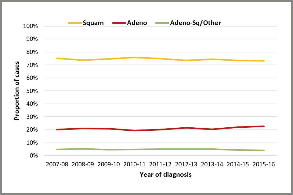 Among cases with known histological type, there was a modest 3% increase (from 20% to 23%) in the proportion of cancers diagnosed as adenocarcinoma between April 2007 and March 2016. Such a small increase suggests that the proportion of cancers in each histological type has remained constant over time (see Figure 6 below).