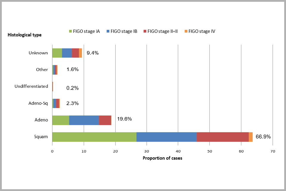 Bar chart showing proportion of cervical cancer cases diagnosed between April 2013 and March 2016, by histology and FIGO stage