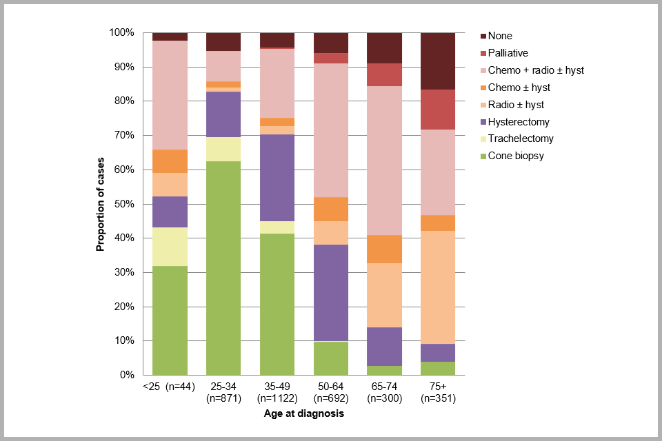 Bar chart showing proportion of cervical cancer cases by treatment received, by age at diagnosis