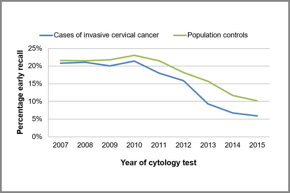 The proportion of cytology tests that resulted in early recall decreased from 22% (708/3,705) to 6% (73/1,234) among people with cervical cancer and from 22% (1,596/7,404) to 10% (110/1,086) among people without cancer (see Figure 9 below).