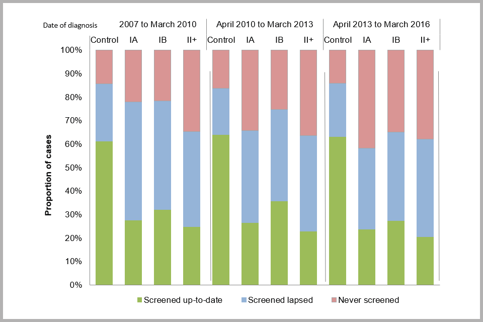 Overall, between April 2013 to March 2016 the proportion of people diagnosed with cervical cancer who were up-to-date with screening was statistically significantly lower among cases than controls (20 to 27% compared with 63%).