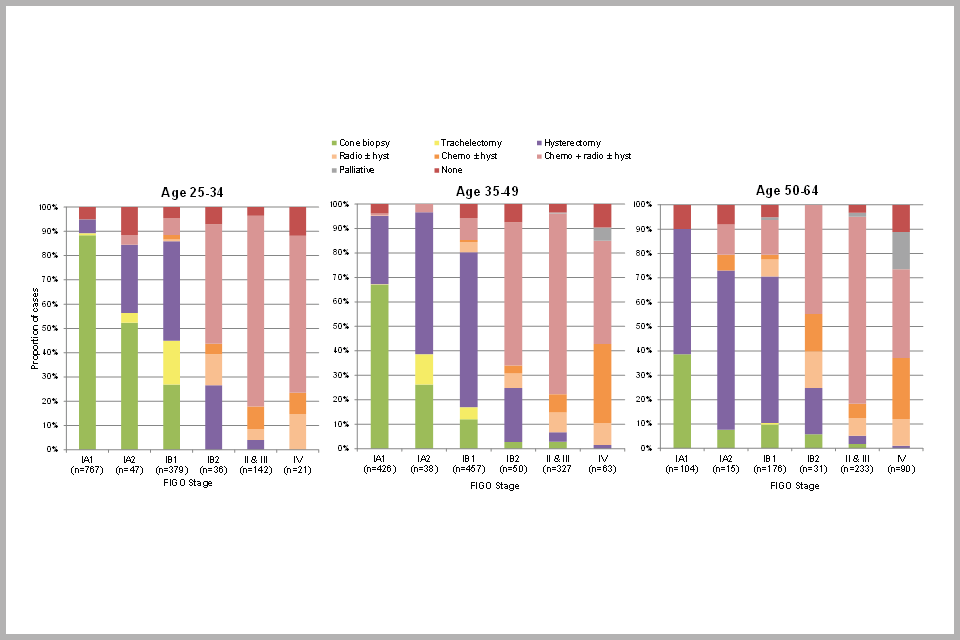 Bar chart showing proportion of cervical cancer cases by treatment received, by FIGO stage and age at diagnosis