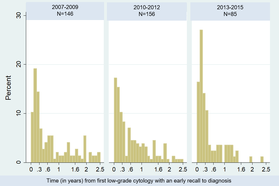 Bar chart showing time from first borderline or low-grade dyskaryosis test to diagnosis, by year the cytology test was taken: percentage of women with cervical cancer and a test within 2 years of diagnosis