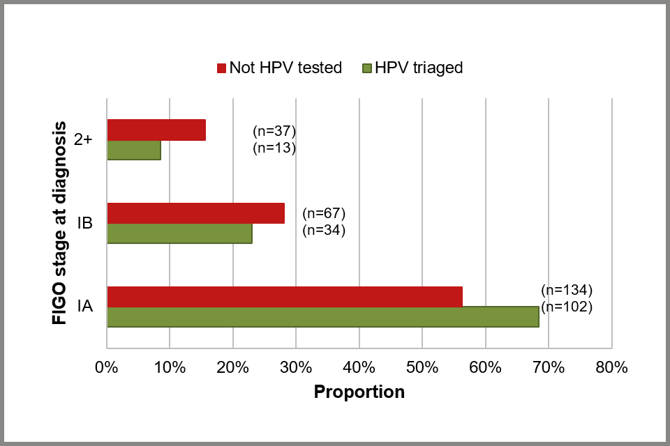 Bar chart showing estimated proportion of cervical cancer cases by FIGO stage, by HPV triage status among those with a borderline or low-grade cytology within 2 years of diagnosis