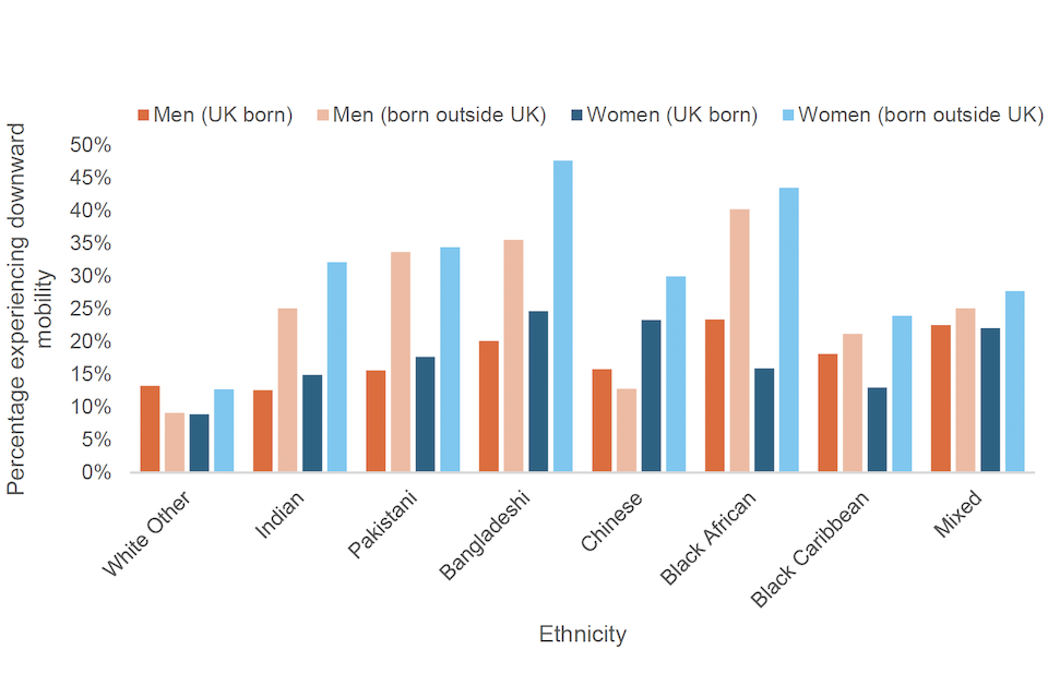 Some Black and minority ethnic groups, such as Bangladeshi, Black African and Other Asian groups, are much more likely to experience downward mobility, even after accounting for their educational qualifications and other individual characteristics. These effects are concentrated amongst those born outside the UK, which is the vast majority for adults in these groups.