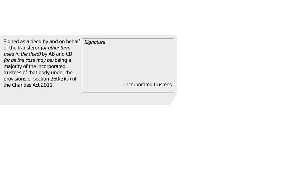 Where the charity trustees are incorporated as a body corporate under Part 12 of the Charities Act 2011 (or Part VII of the Charities Act 1993) then any disposition in favour of the charity must describe the trustees as: