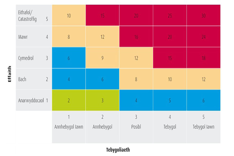Mae’r risgiau wedi’u dosbarthu fel a ganlyn: