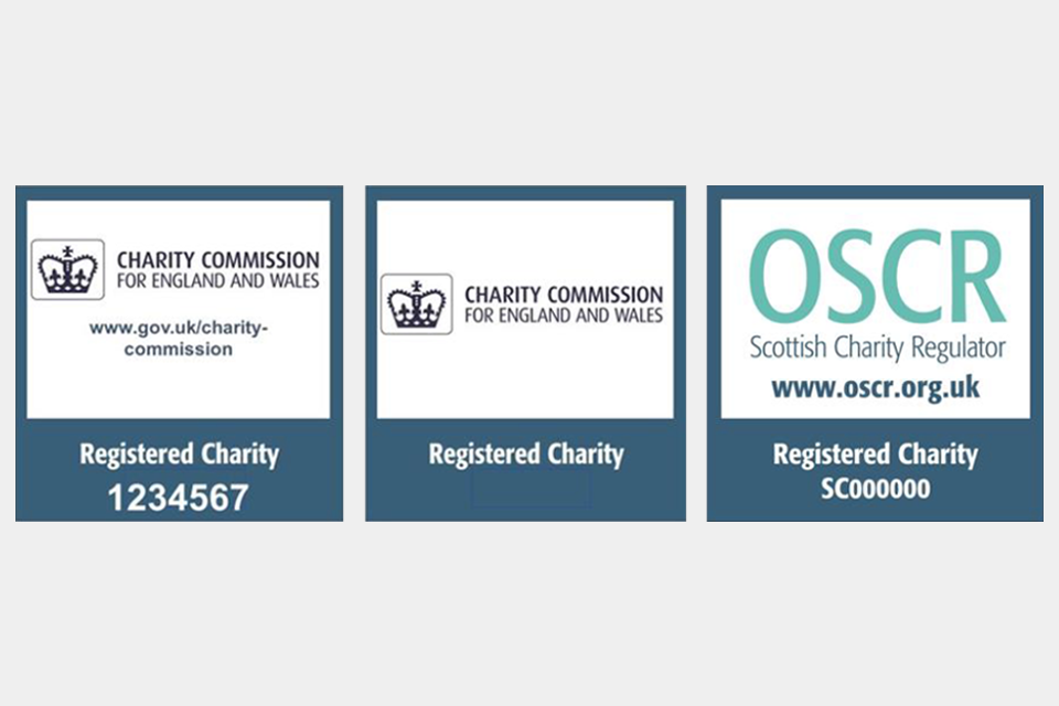 Images showing charity example of Charity Commission logos with text Registered charity 123456. Also logo of Scottish Charity Regulator with text Registered charity SC000000.