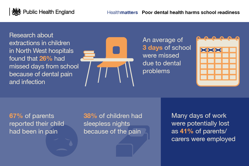 Tooth decay can cause problems with eating, sleeping, communication and socialising, and results in at least 60,000 days being missed from school during the year for hospital extractions alone.