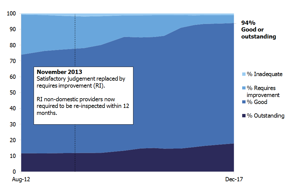 In August 2012, the proportion of providers judged good or outstanding was 74% and by December 2017, this had risen to 94%.