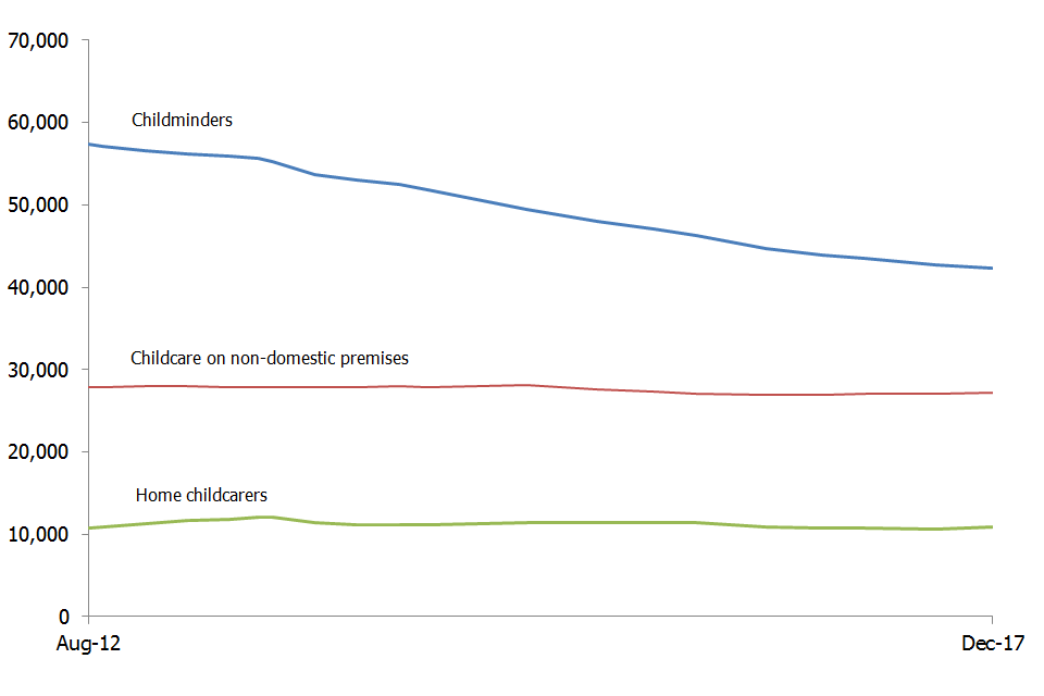 The number of providers of childcare on non-domestic premises and home childcarers has remained fairly stable over time, whereas the number of childminders has decreased significantly between August 2012 and December 2017.