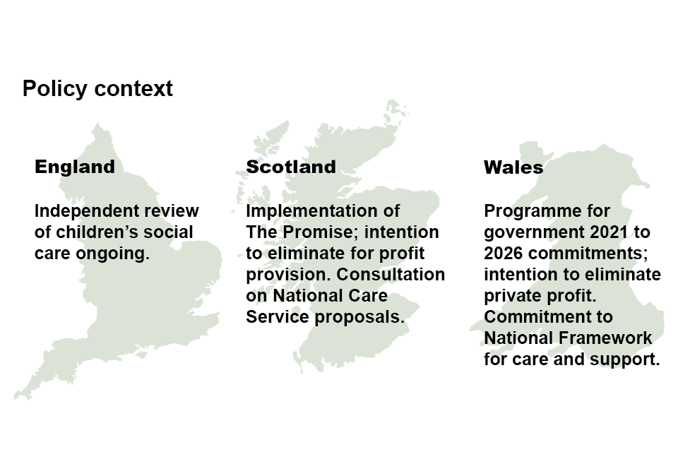 As discussed in Section 2 and Appendix B (PDF, 2.5 MB) the Welsh Government intends to develop a non-statutory market oversight framework. In relation to Scotland, in its consultation on a National Care Service the Scottish Government has sought views on the necessity of a market oversight function for the regulator (CIS), its scope and the potential form of any additional powers the regulator should have to ensure this function is effective. It is not clear, at this stage, whether children’s services will be in scope of any National Care Service, although the Scottish Government has sought views on this as part of the consultation. ↩