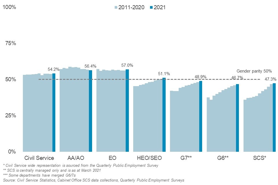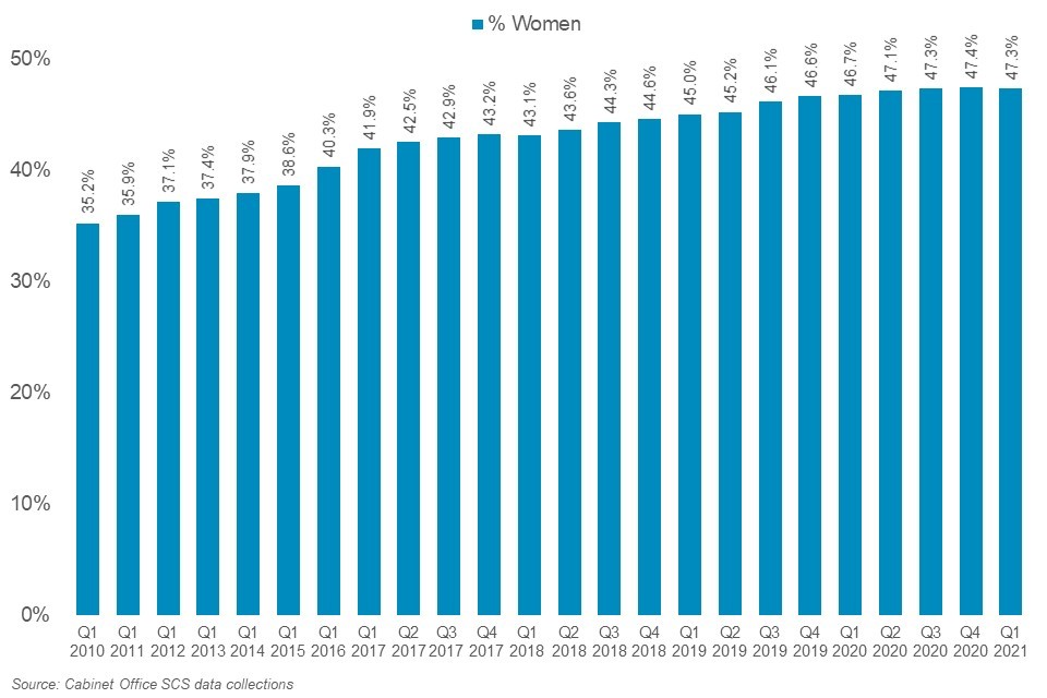 Latest data refer to March 2021, published June 2021. (Civil Service-wide headline statistics by gender.)