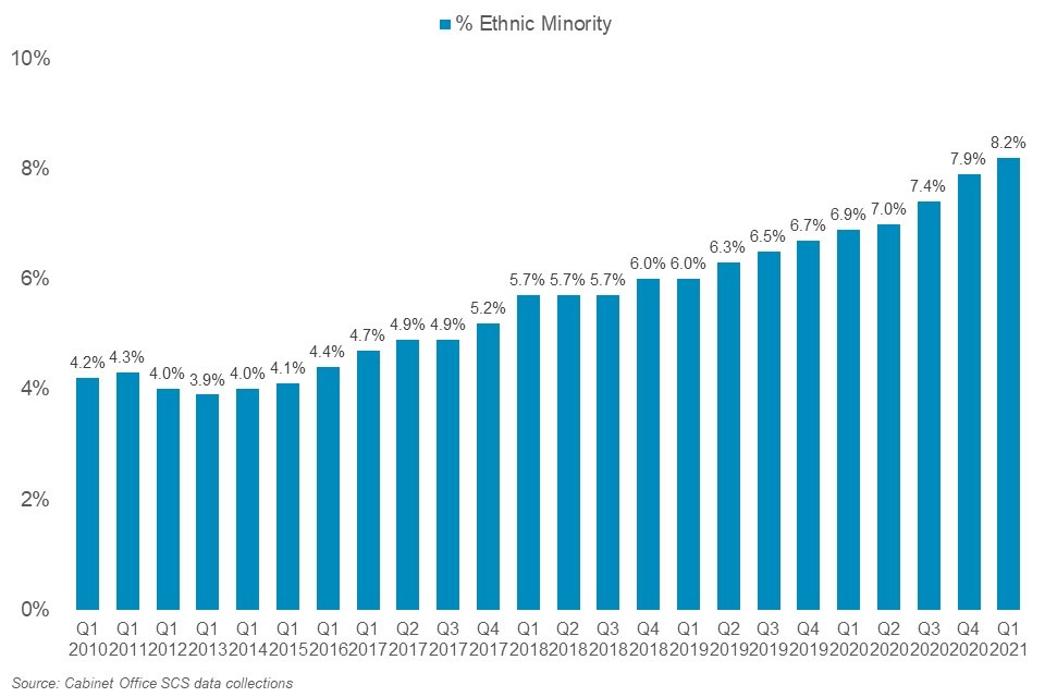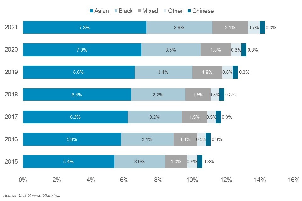 Representation of ethnic groups in the Civil Service, excluding the White ethnic group, 2015 - 2021