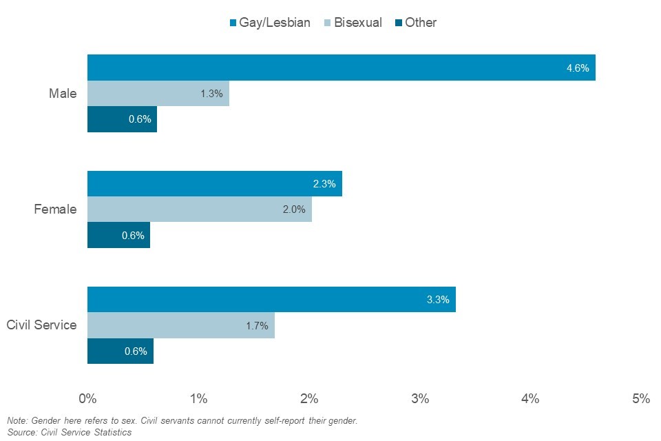 Sexual orientation in the Civil Service, excluding heterosexual, by gender 2021