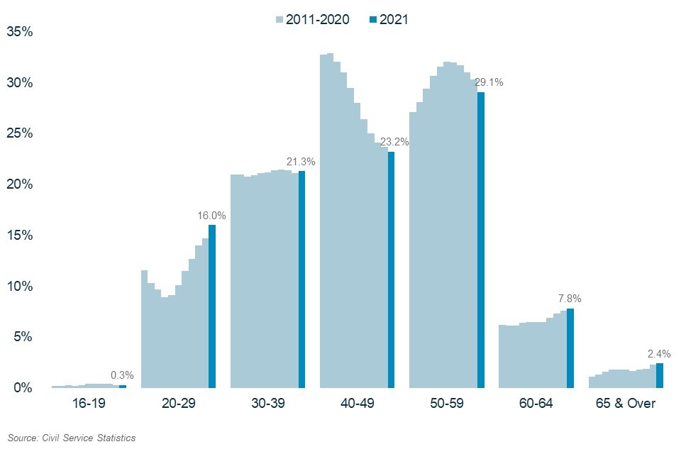 Almost two-thirds of civil servants who reported their age in March 2021 were aged over 40. The proportion of staff aged 40-49 has decreased from 32.6% in 2010 to 23.2% in 2021. In this time, the proportion of staff aged 50-59 has increased from 25.7% in 2010 to 29.1% in 2021.
