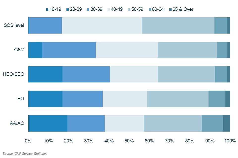 The median age of civil servants is 45. Overall, the median age has decreased from 46 in 2020, but has still increased from age 44 in 2010. There is little variation in median age by grade. The median age is highest at SCS level at 48 at SCS level and lowest at HEO/SEO level at 43. The proportion of SCS level staff under the age of 40 is 16.6%, which is lower than that in Grades 6 and 7, where 33.5% of staff are under 40.