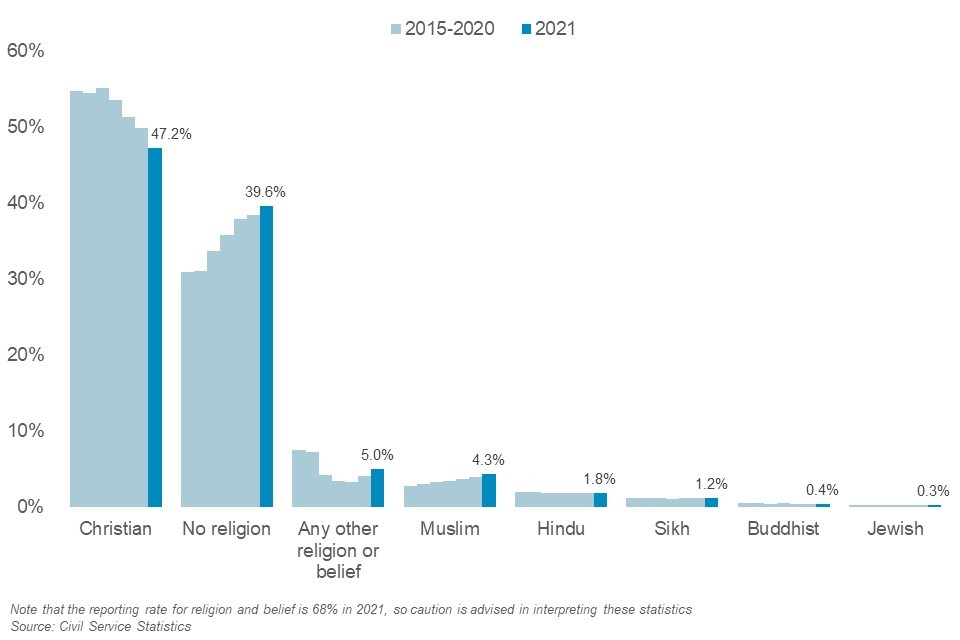 Although in recent years civil servants have been asked to report their religion, belief or non-belief, only 68% of civil servants have done so in 2021. Of those who have, 47.2% were Christian and 39.6% reported they had no religion or belief. The most common reported religion or belief after Christianity was Islam (Muslim) at 4.3%.