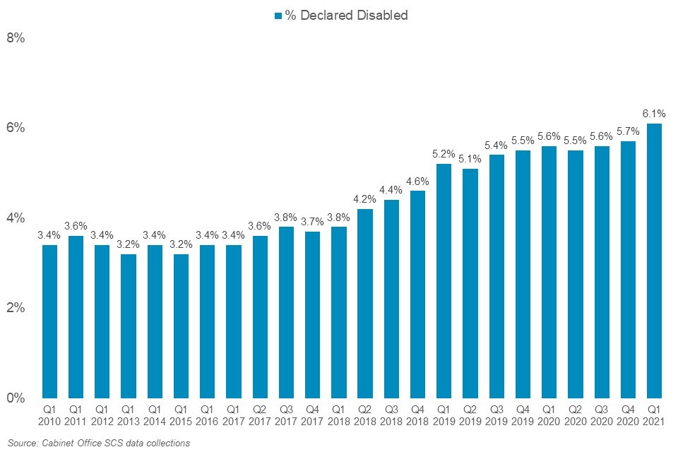 As at March 2021, 6.1% of the SCS have recorded a disability. This percentage has increased since 2010, when it was 3.4%