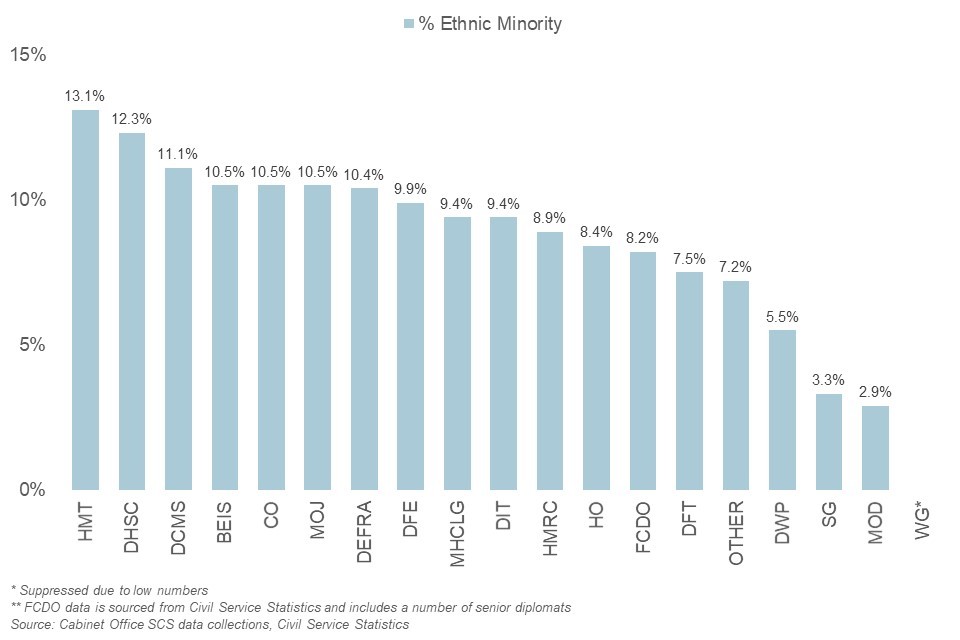 In 2021, representation of ethnic minority staff in the SCS varies from 13.1% at HM Treasury to 2.9% at the Ministry of Defence. Departments with fewer than five recorded ethnic minority staff have been suppressed