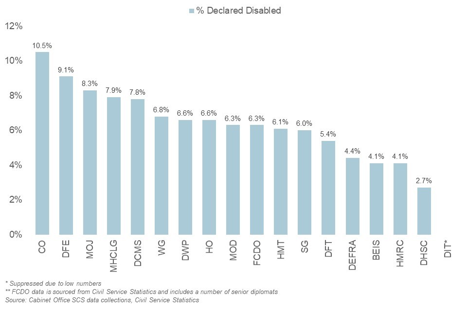 In 2021, representation of disabled staff in the SCS varies from 10.5% at the Cabinet Office to 2.7% at the Department of Health and Social Care. Departments with fewer than five recorded disabled staff have been suppressed.