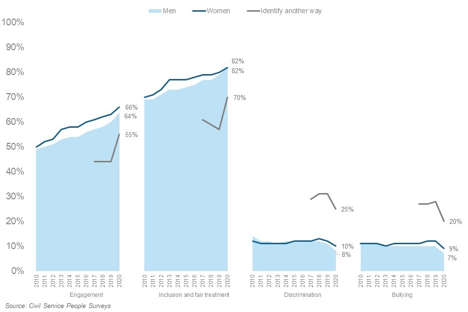 People Survey: engagement, inclusion, discrimination and bullying scores of civil servants by gender, 2010-2020