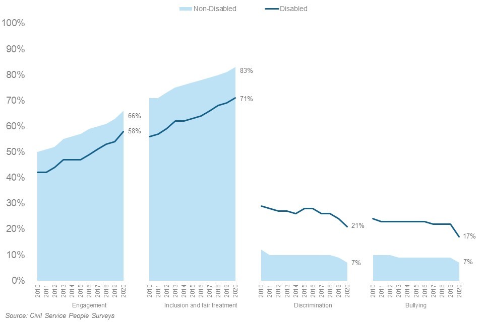 People Survey: engagement, inclusion, discrimination and bullying scores by disability status, 2010-2020