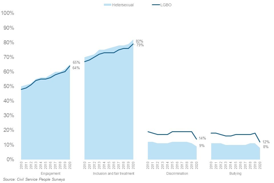 LGBO staff have tended to have slightly lower engagement and inclusion scores than heterosexual staff, and report much higher levels of discrimination and bullying and harassment. In 2020, the inclusion and fair treatment score for LGBO staff was 79%, compared to 82% for heterosexual staff.